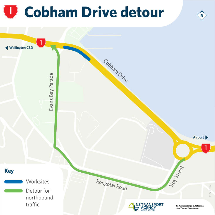 - Northbound detour via Troy Street, Rongotai Road and Evans Bay Parade. Southbound traffic can travel as normal