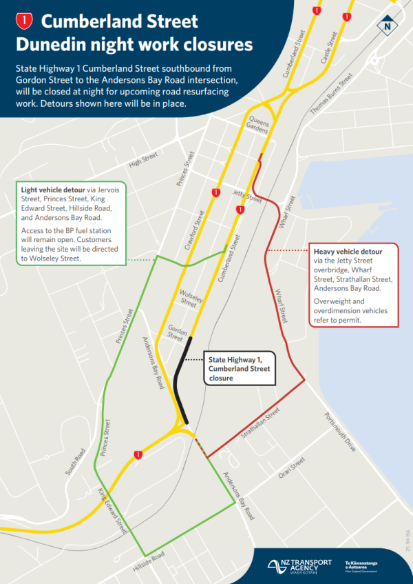 A detour will be available for light vehicles via Jervois St, Princes St, King Edward St, Hillside Rd, and Andersons Bay Rd. For heavy vehicles, it will be via the Jetty St overbridge, Wharf St, Strathallan St, Andersons Bay Rd. Those operating overweight and overdimension vehicles should refer to their permit.