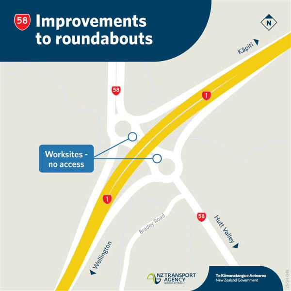 Later this month, NZTA will make layout changes at the double roundabouts on State Highway 58, where it passes under State Highway 1 Transmission Gully.