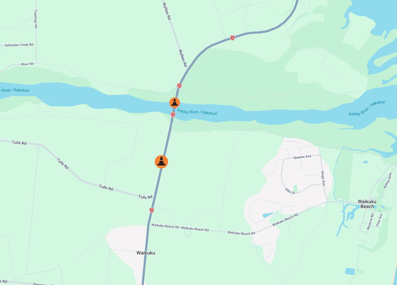 A detour will be in place during this closure. Northbound traffic can turn left onto Rangiora Woodend Road, right onto Golf Links Road, left onto Coldstream Road and right onto Inland Scenic Route 72, before rejoining SH1/Main North Road. Southbound traffic should turn right onto Harleston Road, left onto Inland Scenic Route 72, left onto Coldstream Road, right onto Golf Links Road and left onto Rangiora Woodend Road, before rejoining SH1/Main North Road.