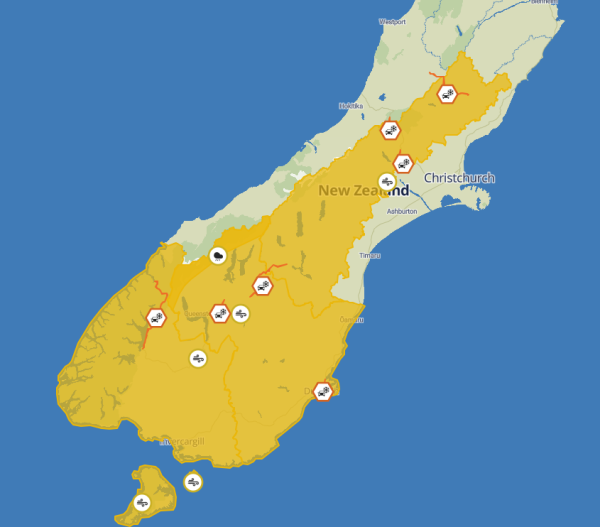 Snow is expected about State Highway 1 Dunedin to Waitati tonight until tomorrow morning and down to 200 metres. The alpine passes across the South Island are also expected to receive some snow, and the Milford Road/State Highway 94 is currently closed from the Hollyford Road intersection to Donne River Bridge due to snow and a rising avalanche risk – but is expected to reopen by 10am tomorrow.