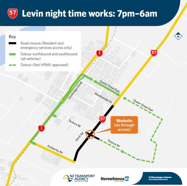 To complete this work safely and efficiently, we will close SH57/Arapaepae Road from Meadowvale Drive to Kimberley Road, and both the eastern and western sections of Tararua Road from SH57.