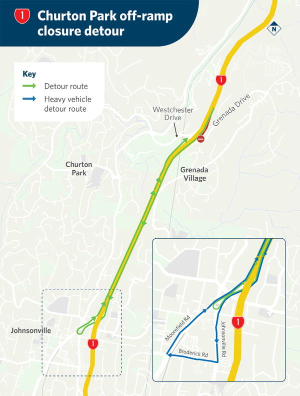 - Heavy vehicles - detour via southbound offramp at Johnsonville, take Johnsonville Road, Broderick Road, and Moorefield Road, before returning to travel north on State Highway 1 to the Churton Park/Glenside northbound offramp