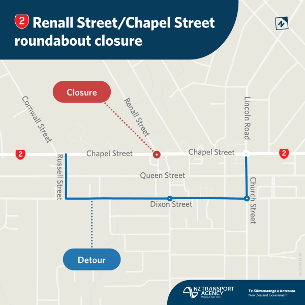 - SH2 CLOSED at SH2 Chapel Street/Renall Street roundabout