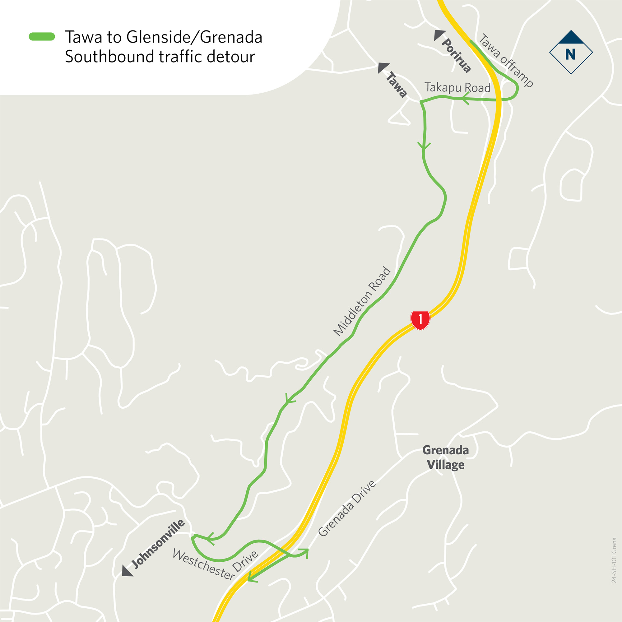 This means southbound drivers (including heavy vehicles) needing to access Grenada must detour by exiting at the Tawa off-ramp, then heading to Grenada via Takapu Road, Middleton Road, and Westchester Drive (see map below).