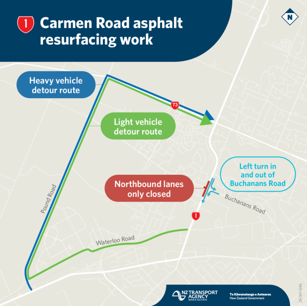 The section of SH1/Carmen Road between Waterloo Road and State Highway 73/Yaldhurst Road is scheduled be closed to northbound traffic on the nights of Tuesday 17 March and Wednesday 18 March, from 9pm to 5.30am the following day.