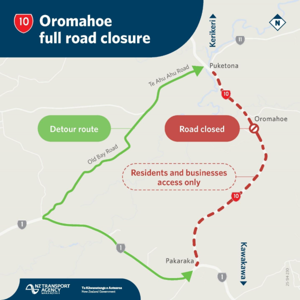 Northbound traffic will detour via State Highway 1 (SH1), Old Bay Road, and Te Ahu Ahu Road, before rejoining SH10. Southbound traffic will use the same detour, in reverse (map below).