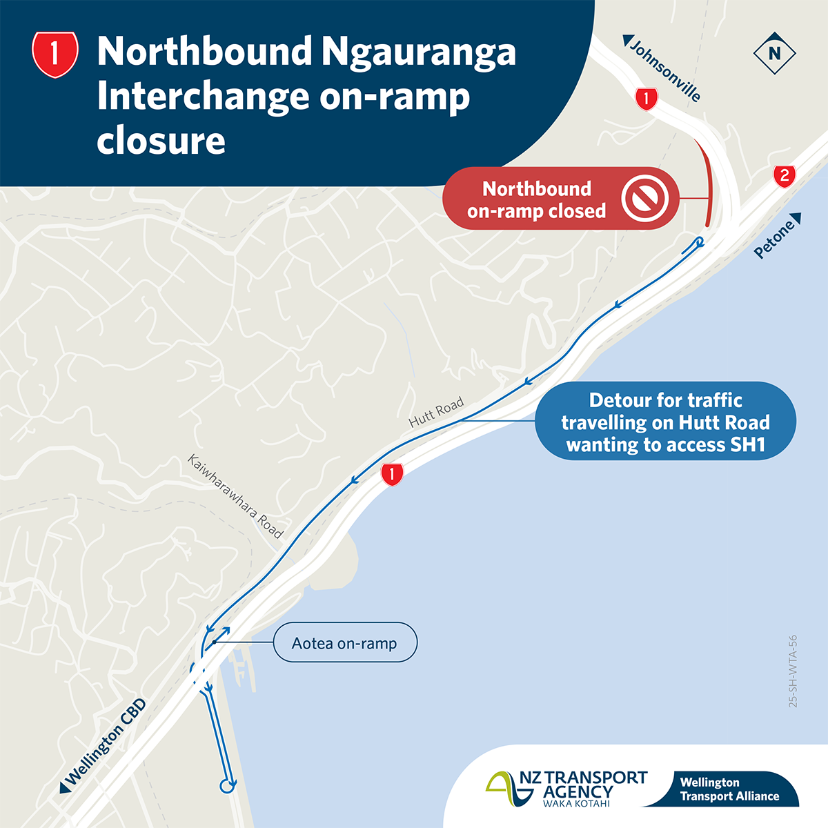 Because of the work involved and the heavy machinery required, the onramp will have to be closed to all traffic from Hutt Road. Northbound drivers wanting to enter State Highway 1 from Hutt Road will need to U-turn, travel south on Hutt Road, and access the highway via the Aotea Quay roundabout instead (see detour map below).
