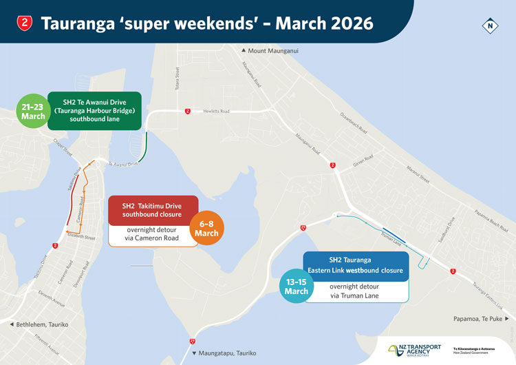 A series of maintenance “super weekends” is coming to State Highway 2 (SH2) this month, beginning on Takitimu Drive from tomorrow (Friday 6 March) to Monday 8 March.