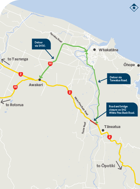 A detour will be in place for all traffic; northbound using Tāneatua Road, Arawa Road, Hinemoa Street and onto SH30 towards Awakeri and southbound traffic will use the same route in reverse. This detour is expected to add up to 20 minutes to journey times and is suitable for all vehicles, including High Productivity Motor Vehicles (HPMV).