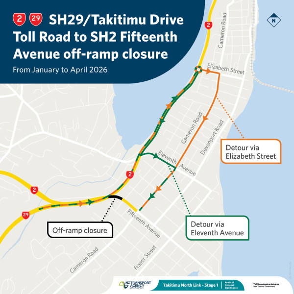 From this Sunday 18 January, the off-ramp from SH29/Takitimu Drive Toll Road on to SH2/Fifteenth Ave will be closed through to late-April 2026 to progress construction for road widening in this area.