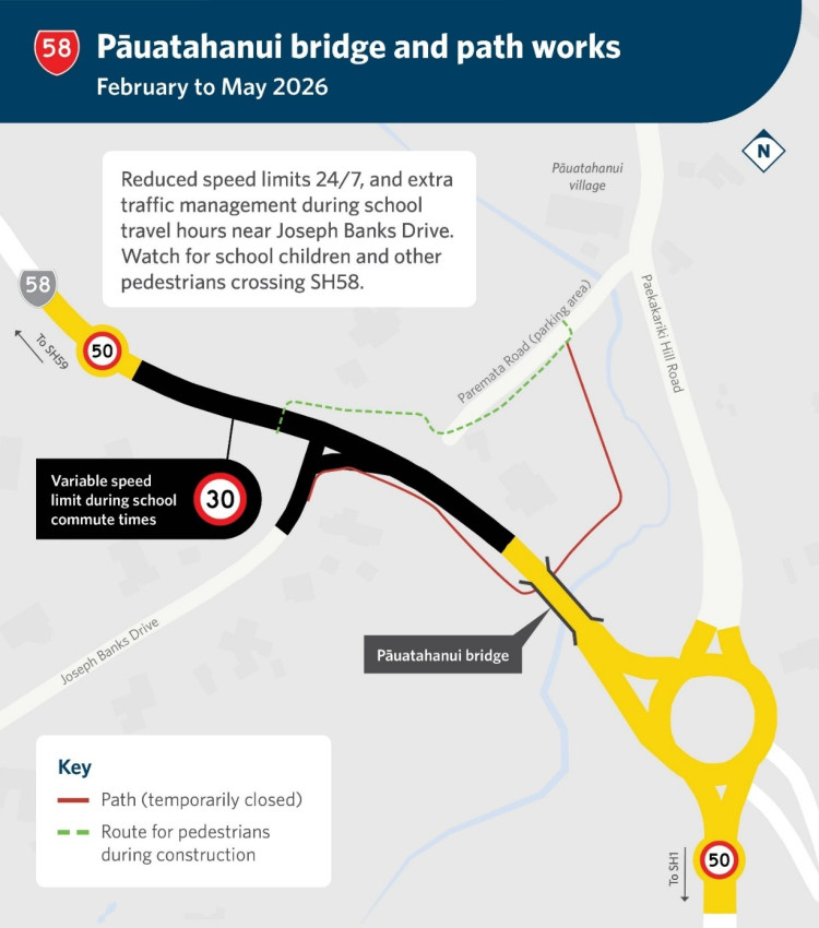 For pedestrians, because the footpath between Pāuatahanui and Whitby that goes under SH58 will be temporarily closed, people will be able to cross the road at the intersection with Joseph Banks Drive (where there’s an existing pedestrian refuge in the centre island).