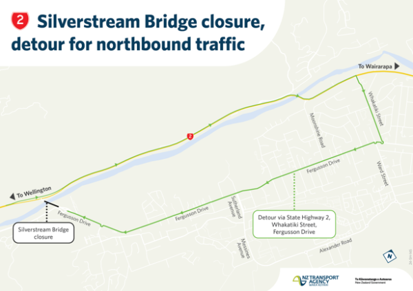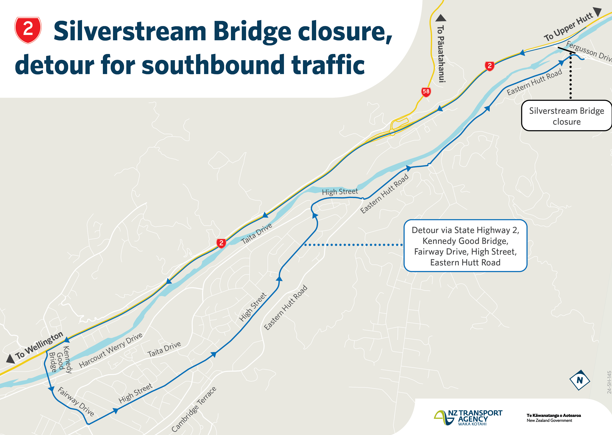 People wanting to access Fergusson Drive and Upper Hutt from State Highway 2 will need to take the signposted detour. Traffic travelling through the Hutt Valley on State Highway 2 will be able to travel as normal.