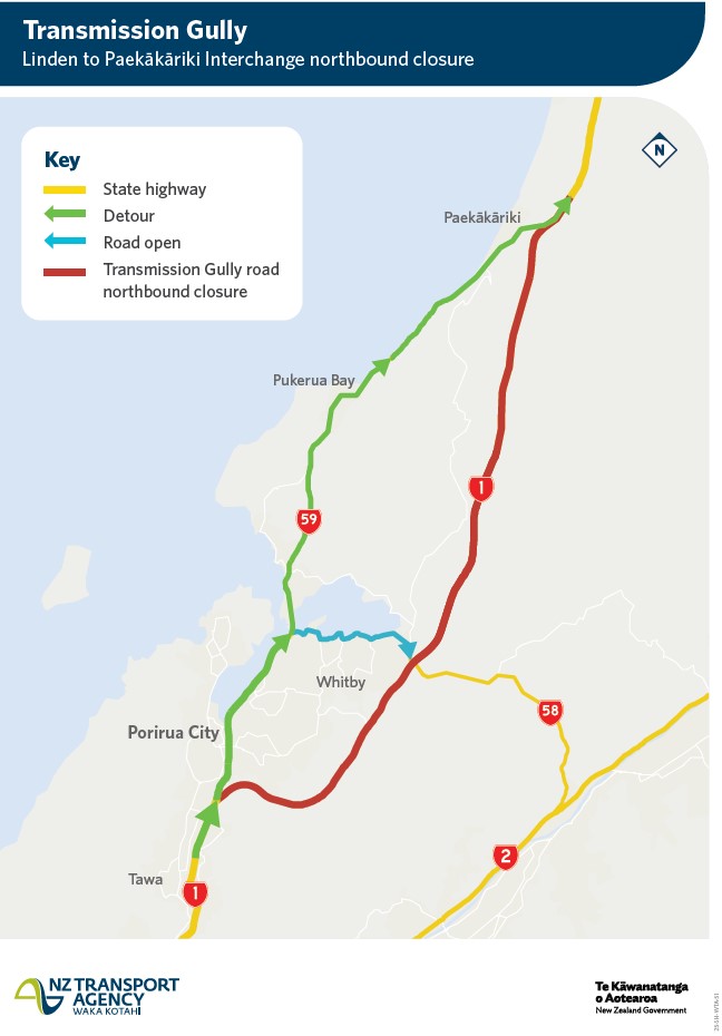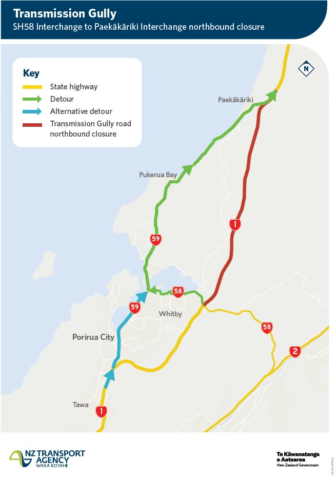 - SH1 Transmission Gully CLOSED from SH58 Interchange to Paekākariki
