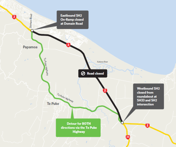 While the Pāpāmoa East Interchange bridge and barrier works are underway, and to ensure peoples safety, SH2 will be closed between Domain Road Interchange and the SH2/SH33 Paengaroa Roundabout. A detour via Te Puke Highway will be in place for all vehicles.