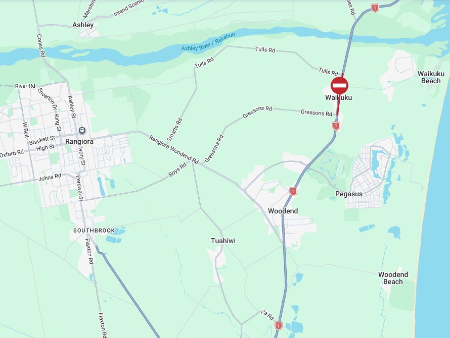 Southbound traffic should turn right onto Tulls Road, continue onto Smarts Road, turn left onto Rangiora Woodend Road, left onto Gressons Road, then right back onto SH1. The reverse applies for northbound traffic.