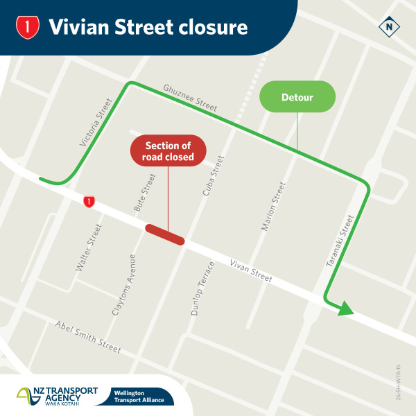 - SH1 Vivian Street CLOSED between Victoria Street and Taranaki Street