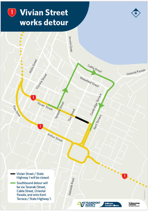 - Local road detour available via Taranaki Street / Cable Street / Kent Terrace